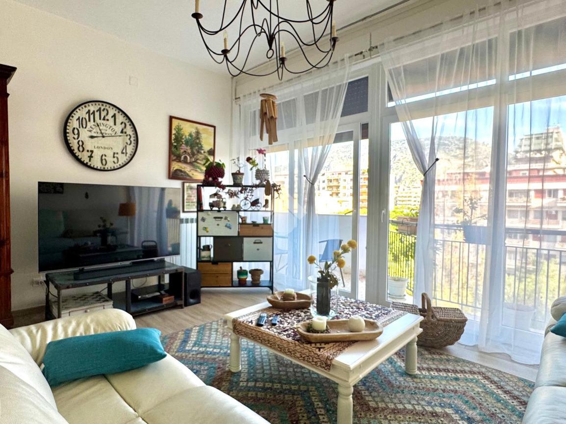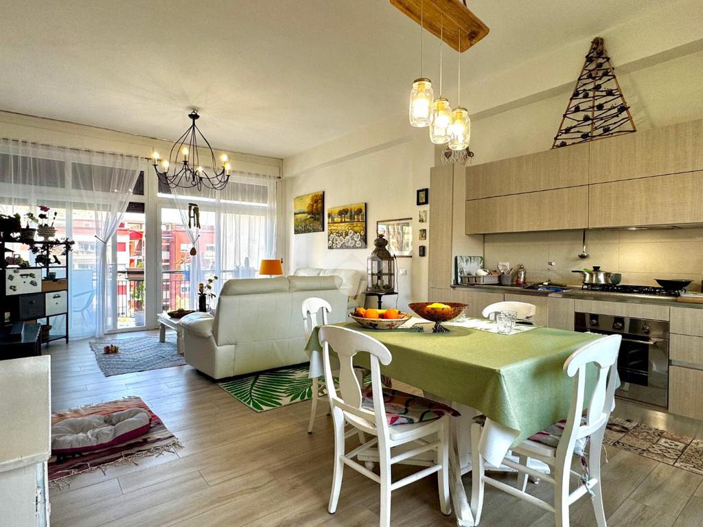 La zona giorno è composta da un moderno soggiorno con cucina open space, ambiente accogliente e conviviale, con balcone affacciato sulla via principale.